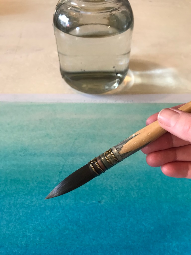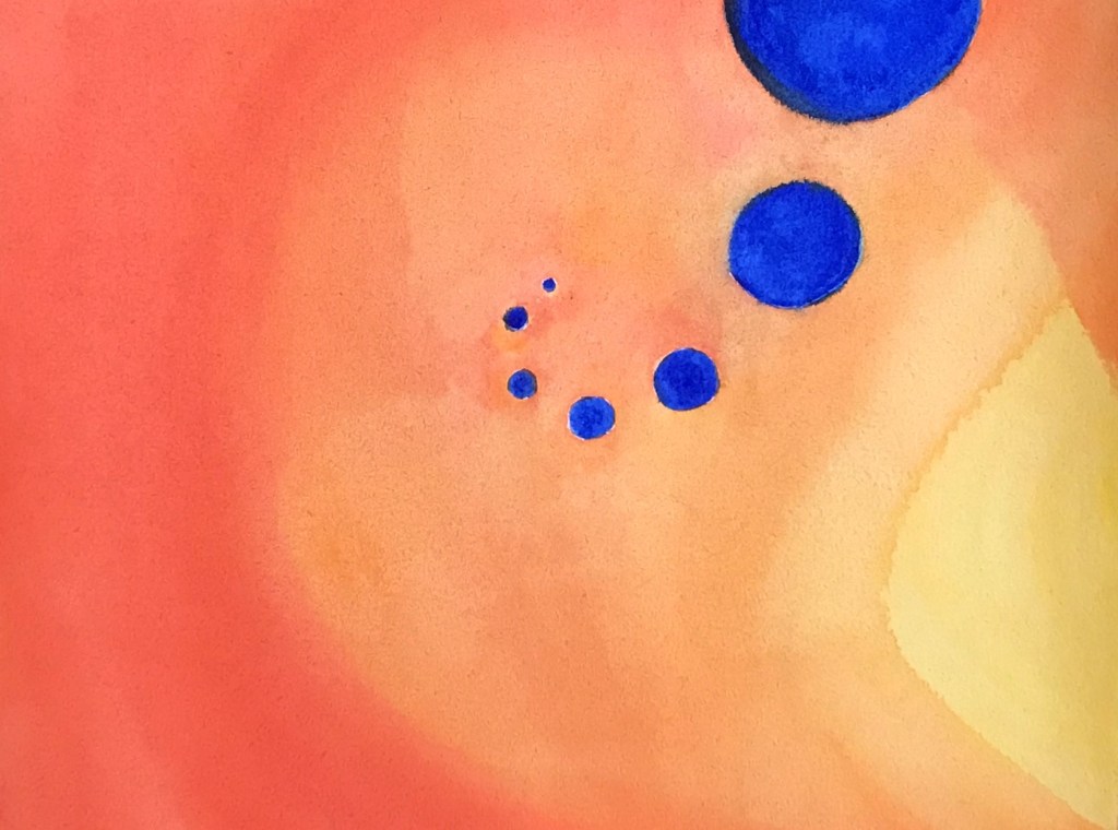 När jag behöver en paus och längtar efter att måla kravlöst, börjar jag gärna med att ge mig själv ett färgbad. Jag blöter ett papper och målar vått-i-vått med en färg som kallar på mig. Helst använder jag ett ganska stort papper och lite bredare pensel så att jag kommer upp i en yta som går att insupa med alla sinnen. Jag badar ögonen i färg och andas in den i varje del av mitt medvetande.