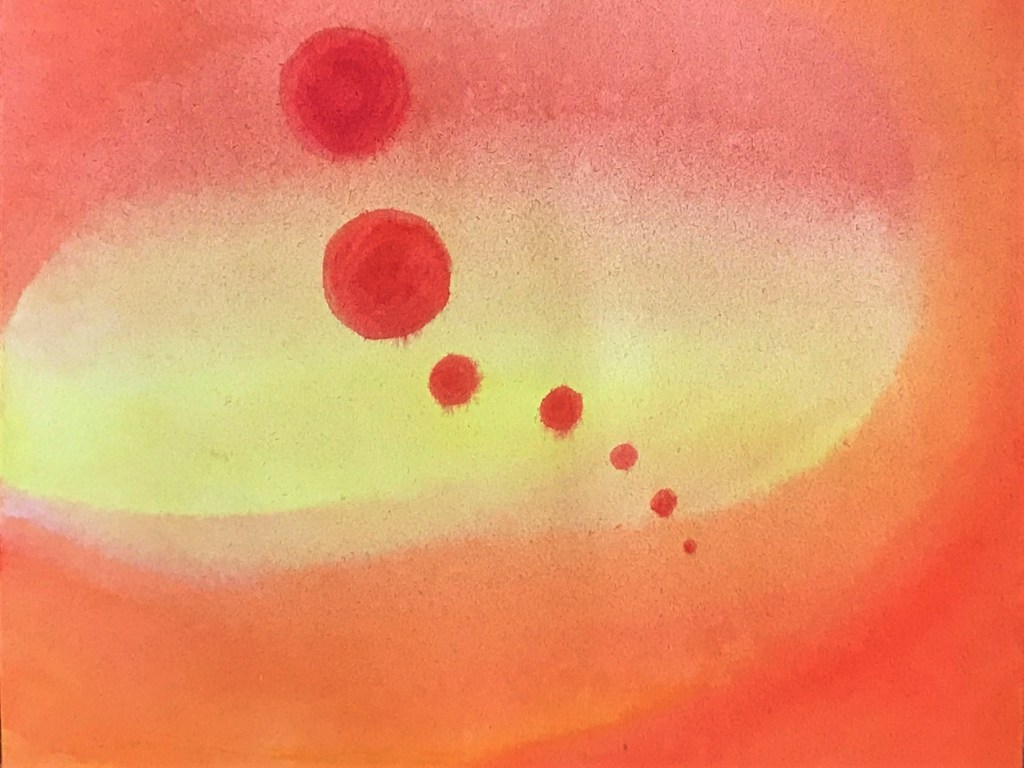 Färg påverkar oss. När min konstterapiklass en gång var hembjuden till en gästlärare på middag, lade jag märke till en tavla som stod lutad mot en vägg i ateljén. Den var rätt stor och helt röd med skiftningar i. Jag sneglade på tavlan hela kvällen och kunde inte bestämma mig för om jag tilltalades av den eller tyckte den var motbjudande. Plötsligt berättade läraren om hur rött kan vara vackert och högtidligt (tänk på röda mattan eller kungliga röda mantlar) men när färgen blir tillräckligt intensiv så associeras den med aggressivitet istället. Tavlan i ateljén var en studie i hur mycket det gick att stegra det röda så att gränsen nåddes för där det varma, vackra övergick i det aggressiva. Det var p r e c i s detta jag hade upplevt utan att kunna sätta ord på!